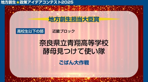 米倉が審査員を務めた高校生以下の部の頂点である「地方創生担当大臣賞」を受賞されたのは次の2チームでした!