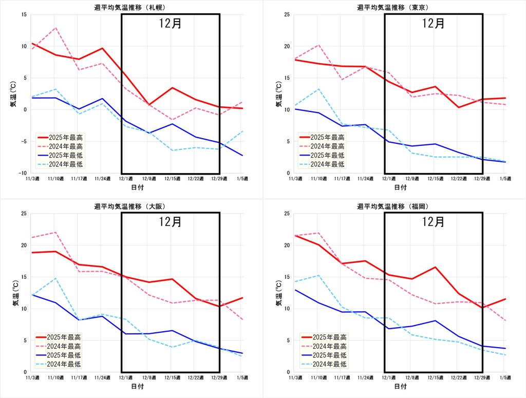 図表2の各都市の気温推移グラフを見ても、2025年12月は全般に気温が高かったことがわかります。