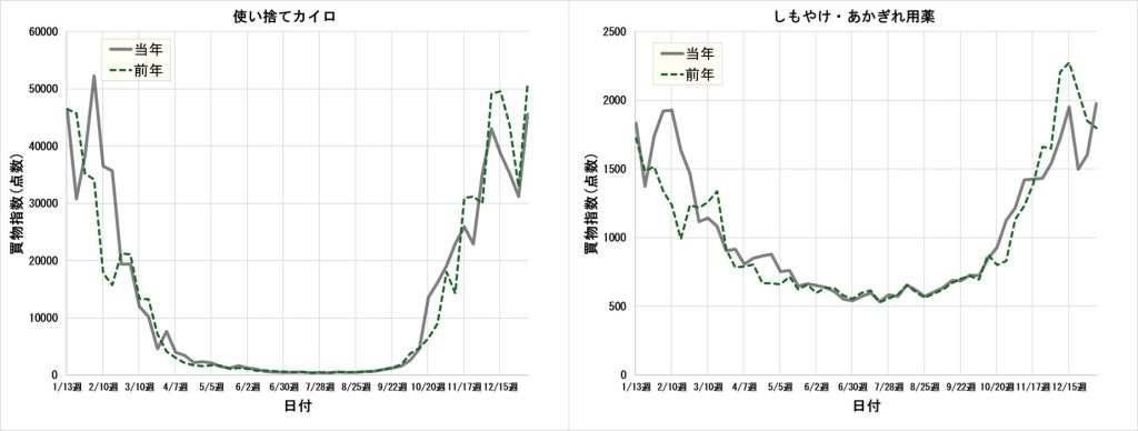 今回、購買動向の調査対象としたのは、寒さ対策商品の代表格である「使い捨てカイロ」と「しもやけ・あかぎれ用薬」の2カテゴリです。