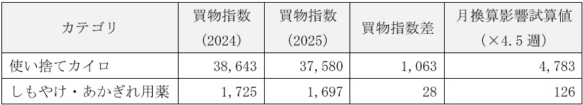 試算の結果、12月の高温によって、1か月あたり「使い捨てカイロ」は4,783、「しもやけ・あかぎれ用薬」は126(いずれも買物指数ベース)、前年よりも需要が消失したと見積もられます。