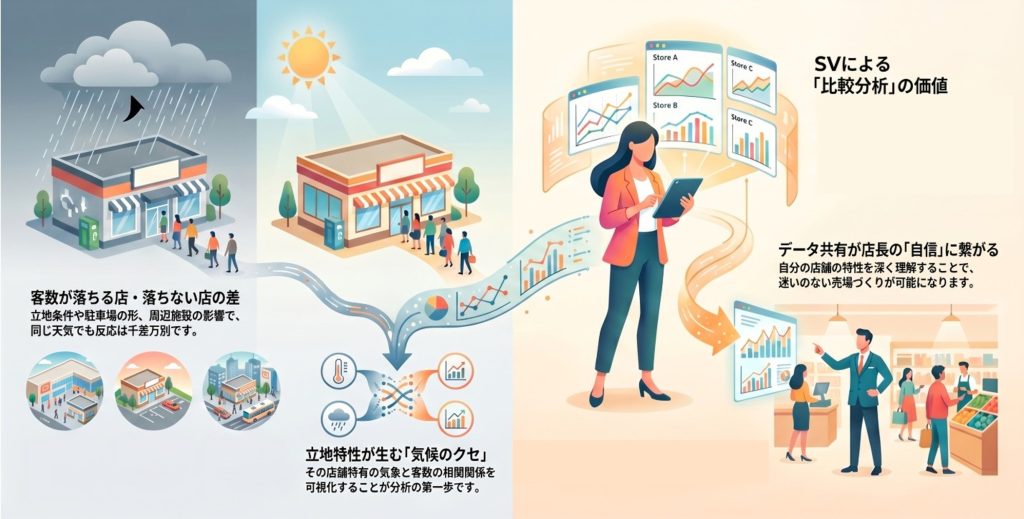 SVの方々の強みは、担当する複数の店舗を比較することで、各店舗固有の「気候のクセ」を抽出できる点にあります。この固有の傾向をデータから読み解き、店長と共有することで、店長が自分の店舗が持つ立地特性を深く理解し、より自信を持って売場づくりに取り組めるようになるはずです。