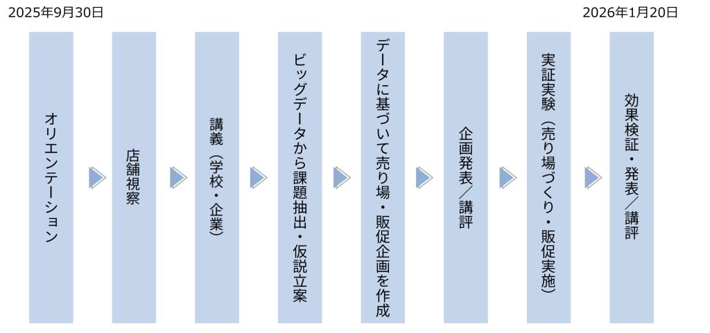 近年、消費者の購買行動は多様化し、小売業では勘や経験だけではなくデータに基づいた施策立案や売場づくりが求められています。このプログラムでは、学校での授業に加え、連携企業によるデータ分析や売り場作り・販促に関する講義を実施します。グループワークや店舗視察を行った後、売り場をプランニングし、実際に店舗で展開します。立案から効果検証までを経験することで、社会で役立つ実践的なスキルが身に付きます。