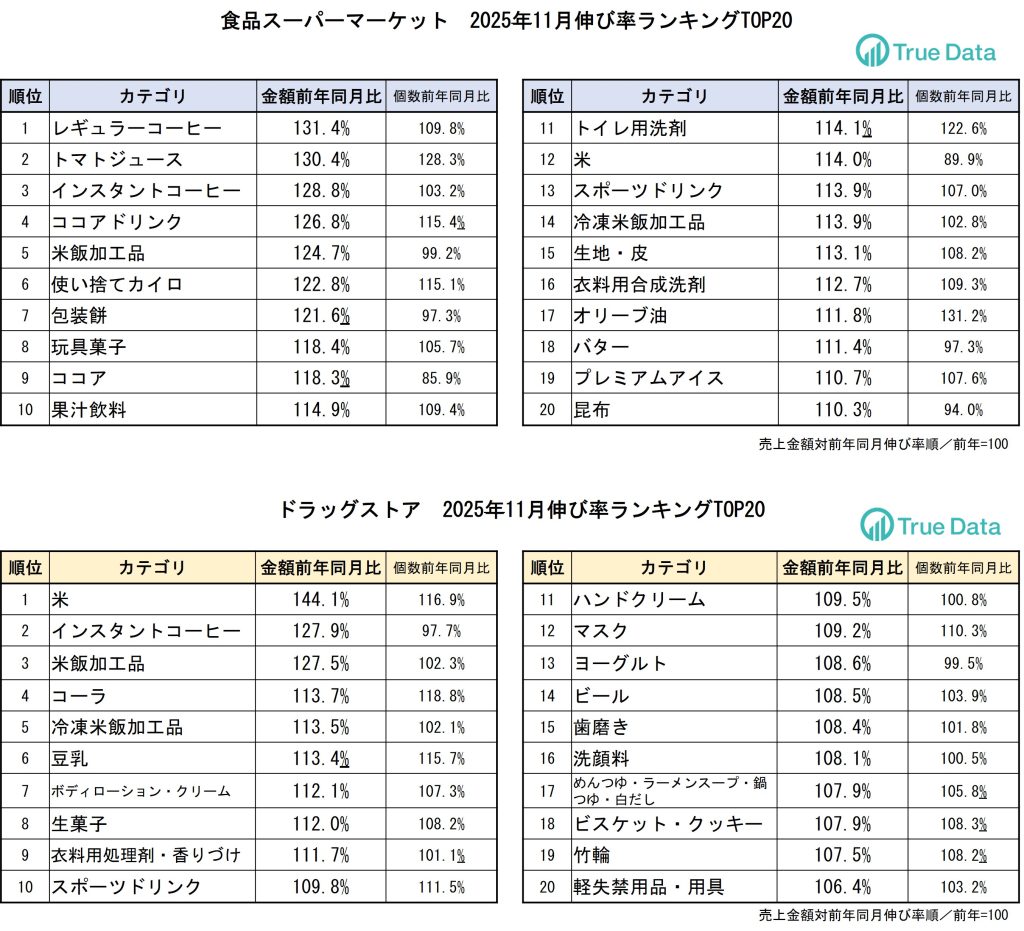 ビッグデータプラットフォームを運営する株式会社True Data(トゥルーデータ/本社:東京都港区、代表取締役社長:米倉 裕之、証券コード4416)は、当社の統計データをもとに、ドラッグストア、食品スーパーマーケットにおける2025年11月の売り上げ伸長カテゴリを発表します。